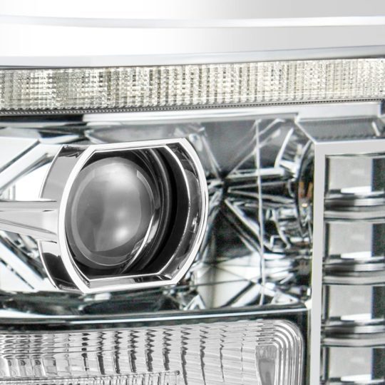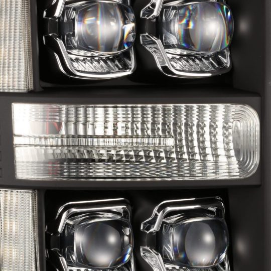 The AlphaRex 880254 03-06 Chevrolet Silverado/02-06 Avalanche (without body cladding) NOVA-Series LED Projector Headlights Alpha-Black are advanced LED headlights designed to improve your driving experience. They feature three 3D ice-cube projectors and matching bumper lights, as well as a versatile light tube that can act as both DRL and turn signal lights. The light tube can be configured to display white or amber, and also includes a sequential turn signal in amber. Additionally, an activation light adds a stylish touch when starting the vehicle. The projectors are dedicated to low beam functionality, with the outer two activating when high beams are engaged. These headlights and bumper lights are a stylish, functional, and safe upgrade for your Chevrolet Cateye Silverado.