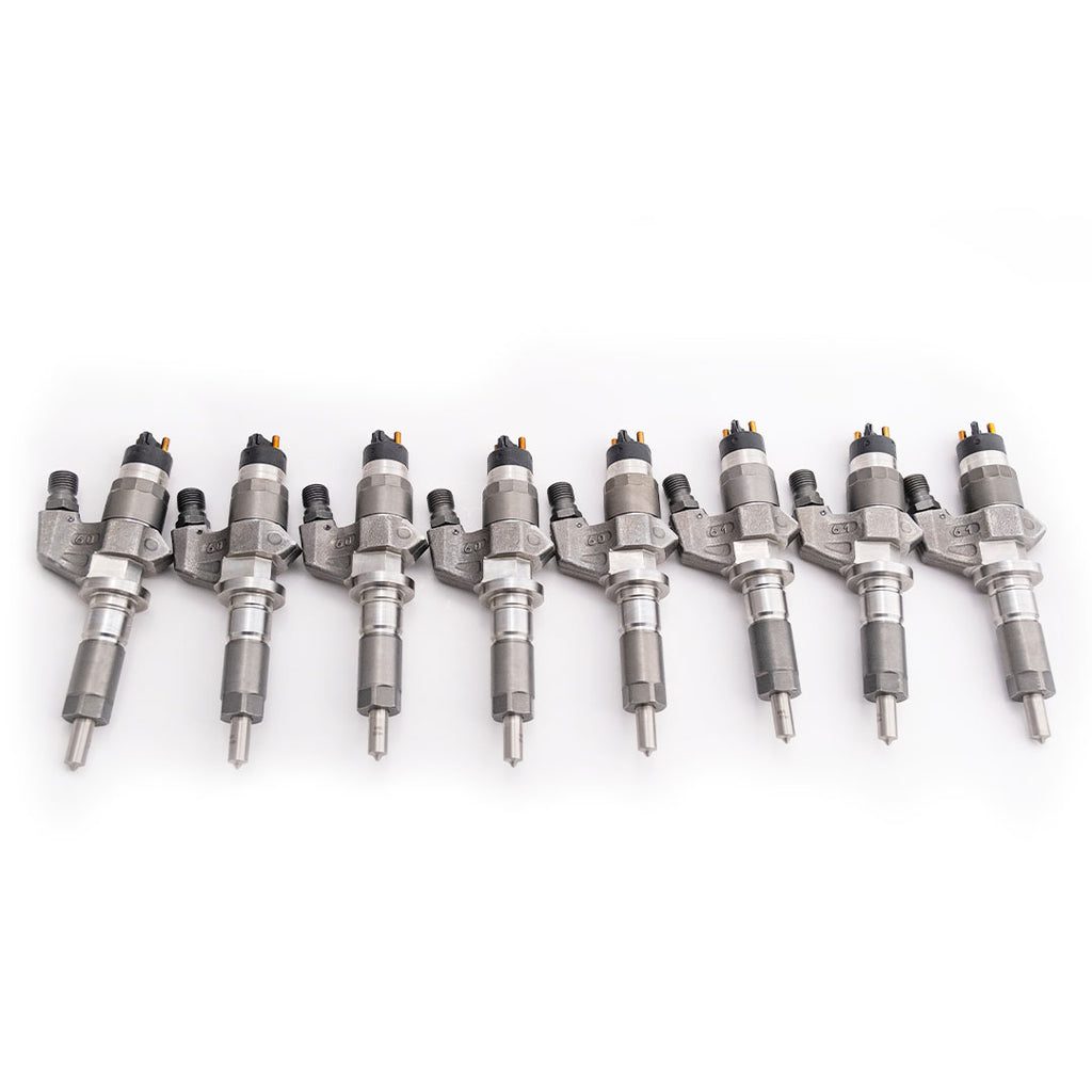 Chevy Duramax 2001-2004 LB7 6.6L Injector Set: Remanufactured injectors flowing at 45 percent over, capable of 675 RWHP with proper supporting modifications. Biggest injector recommended for stock CP3 pump or turbo.