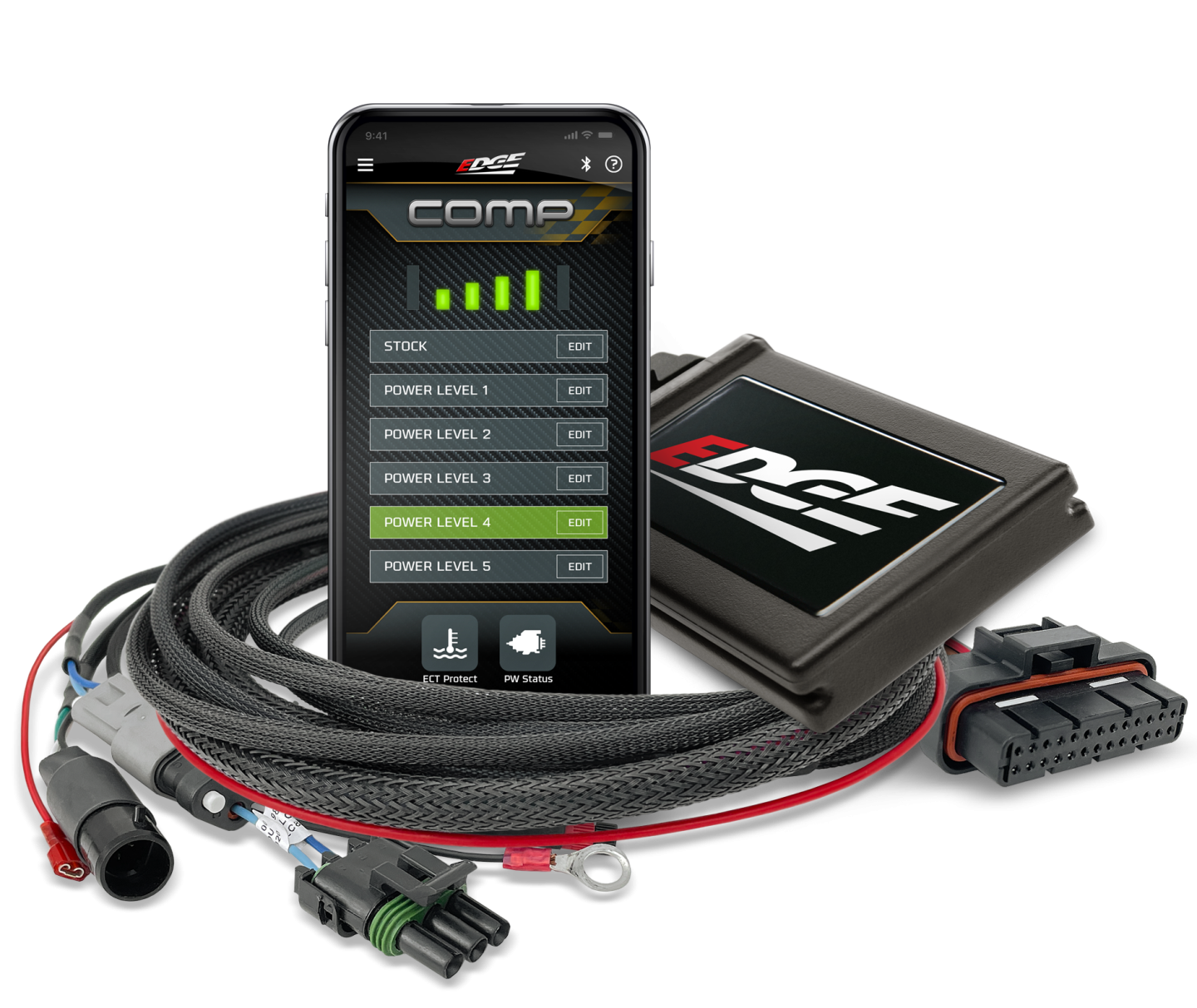 The Edge Comp Box 2.0 introduces smartphone-based tuning control. The Edge app is available for both Android and iOS devices, allowing drivers to adjust tuning parameters directly from their phone.