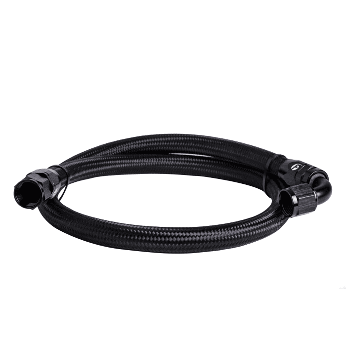 - Black braided nylon coolant bypass hose with AN fittings