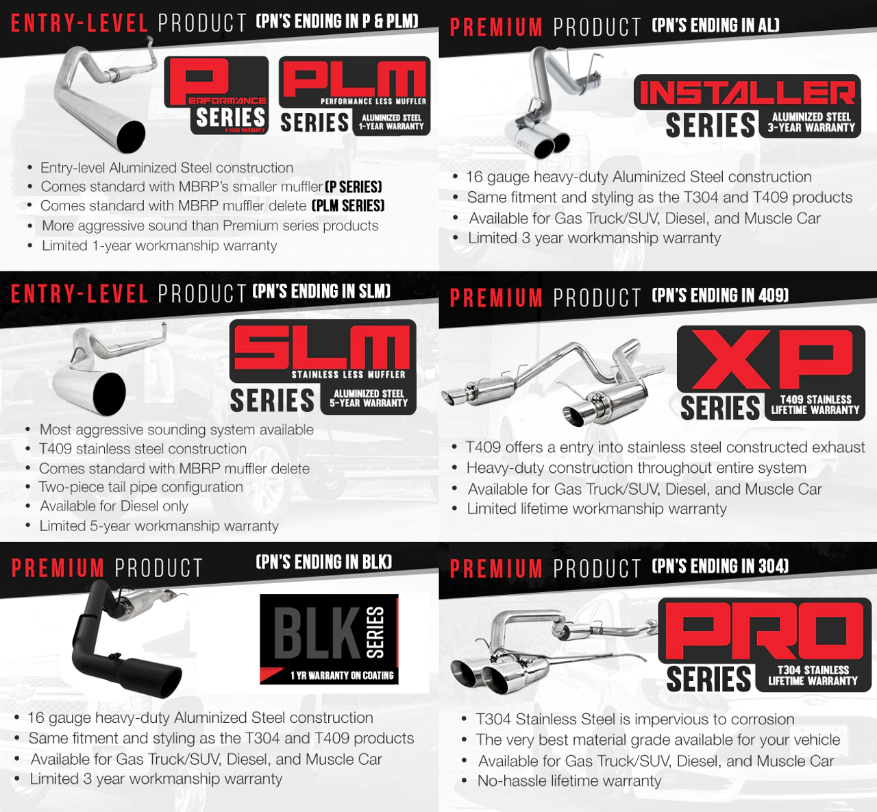 MBRP Armor Plus exhaust systems include a lifetime warranty on T409 stainless steel components, providing long-term confidence and coverage for material and workmanship defects when installed on the original vehicle.