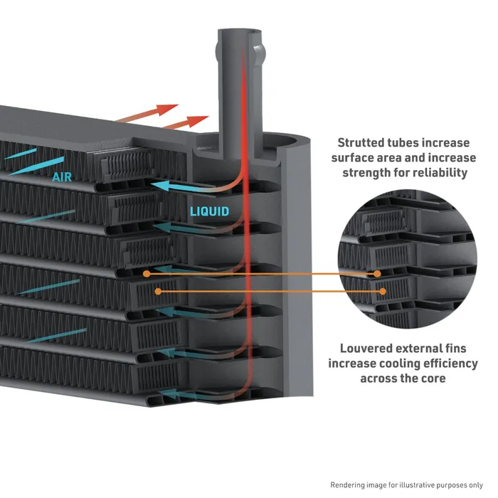 - 197-percent increase in fluid capacity over stock cooler