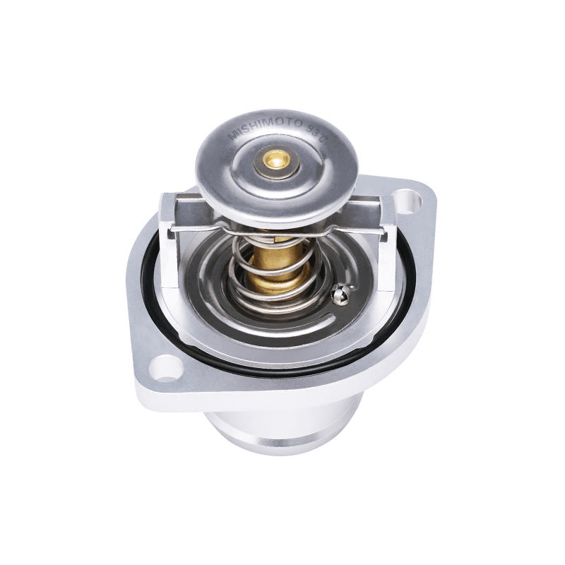 - Higher activation temperature restricts coolant flow for a longer time, resulting in quicker engine warm-up (Mishimoto thermostat activates at 200 F vs. factory 192 F)