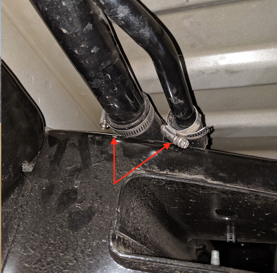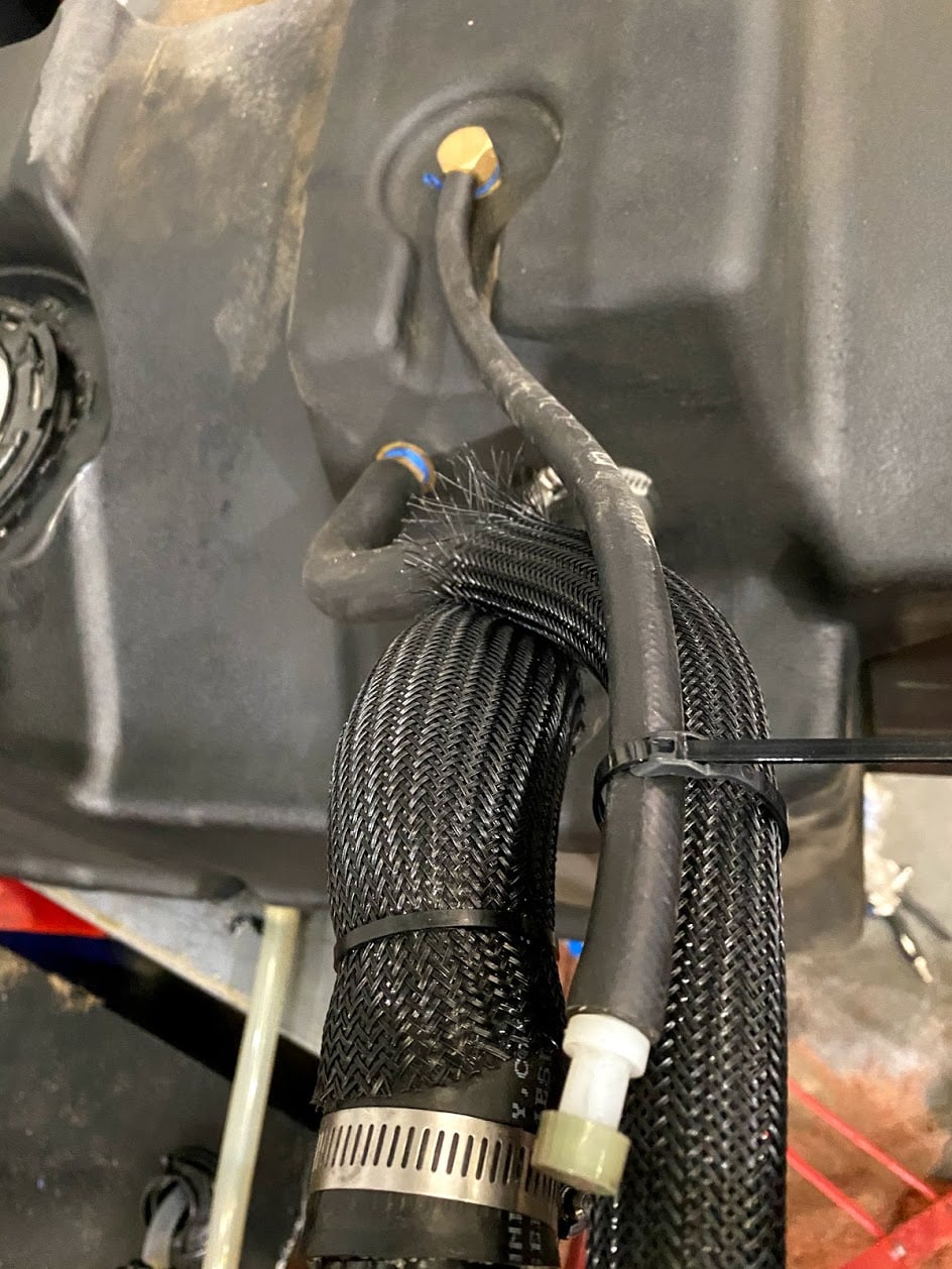 Route hose over crossmembers and zip tie to the filler neck