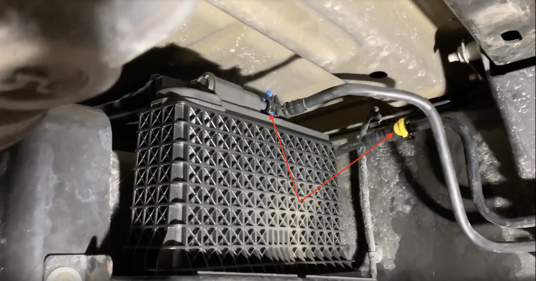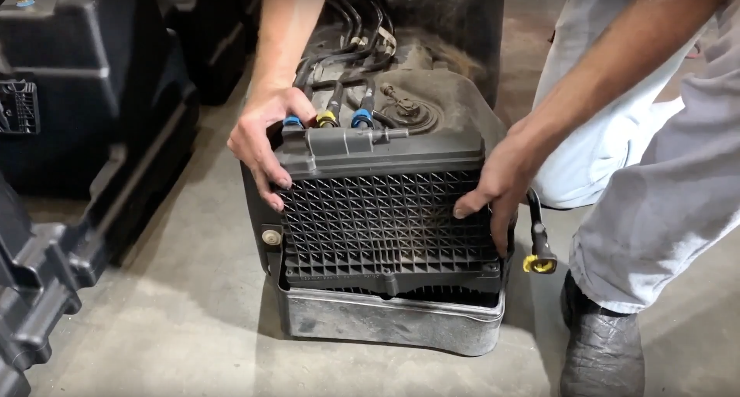 Remove the two fuel lines positioned on top of the fuel water separator. For the blue connector, push both tabs towards the rear of the vehicle and remove the line. For the yellow connector, pull the locking tab out and depress the upper tab to remove the connector.