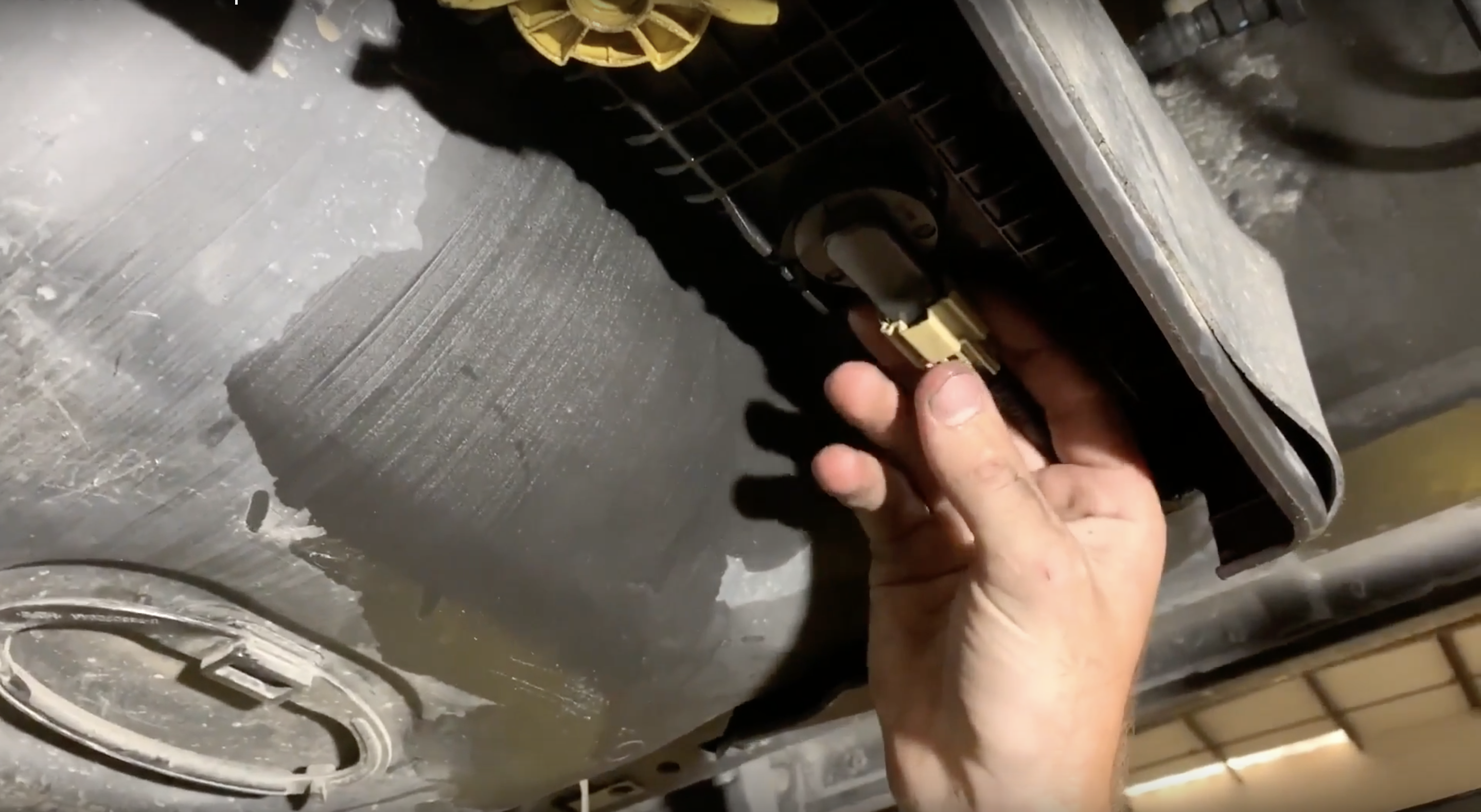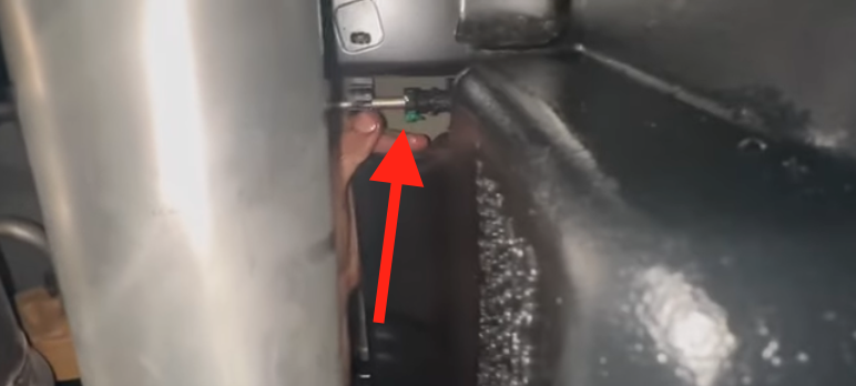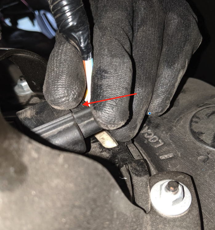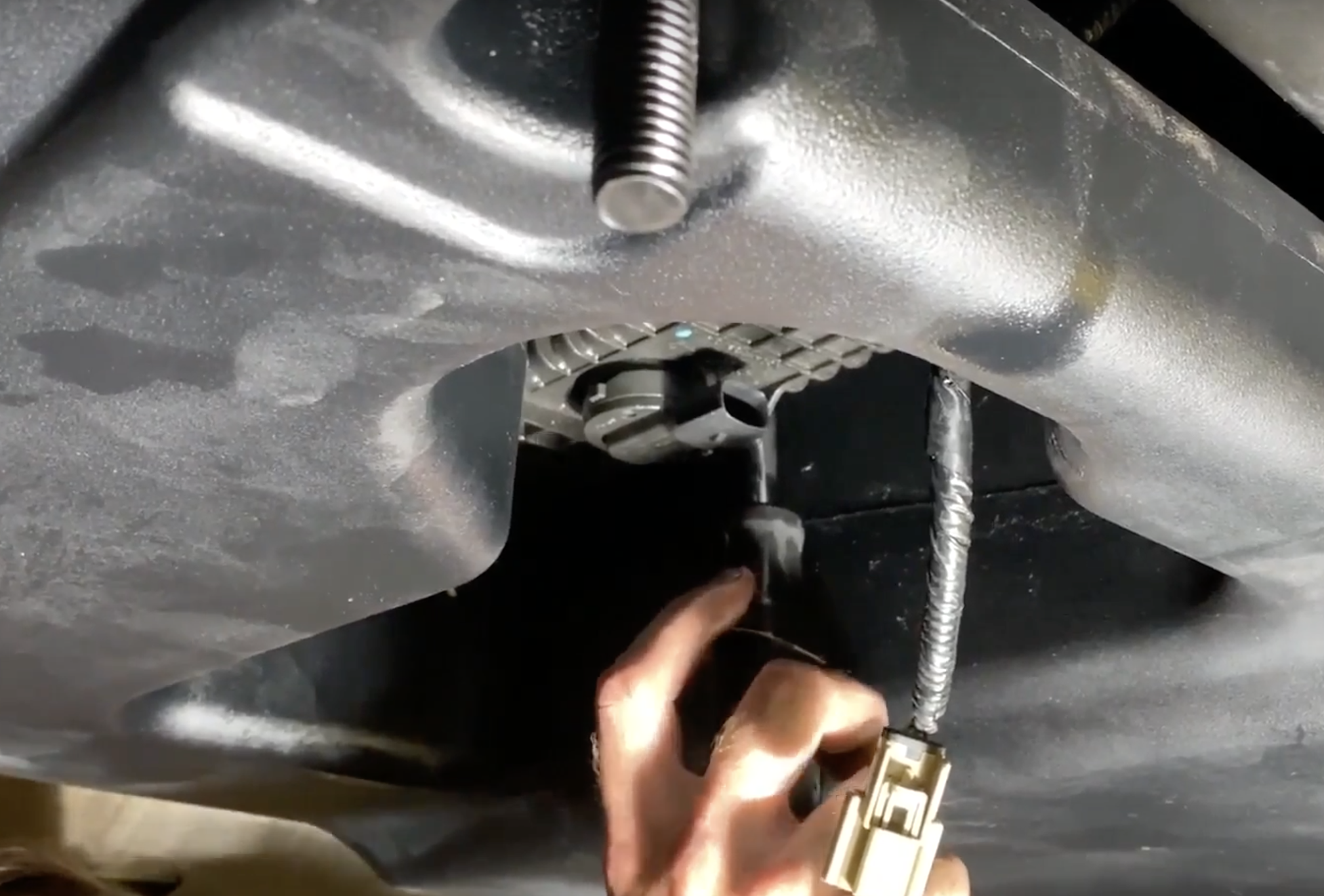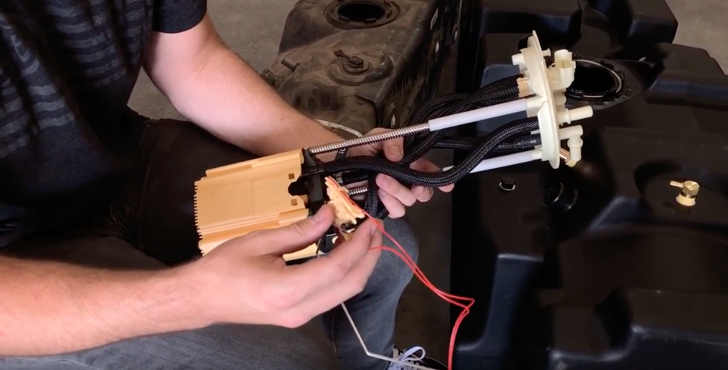 Reach over the frame rail to disconnect the electrical connection for the sending unit. Depress the tab and the connector will release.