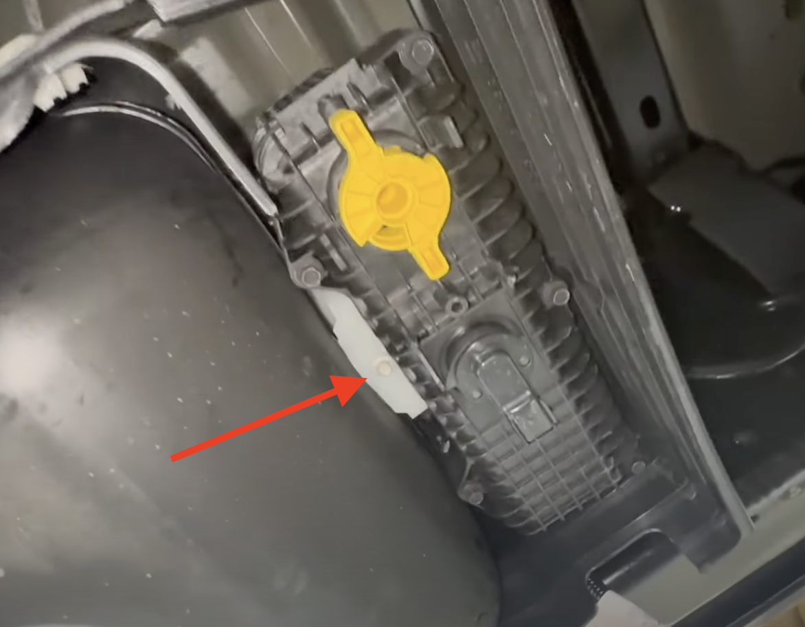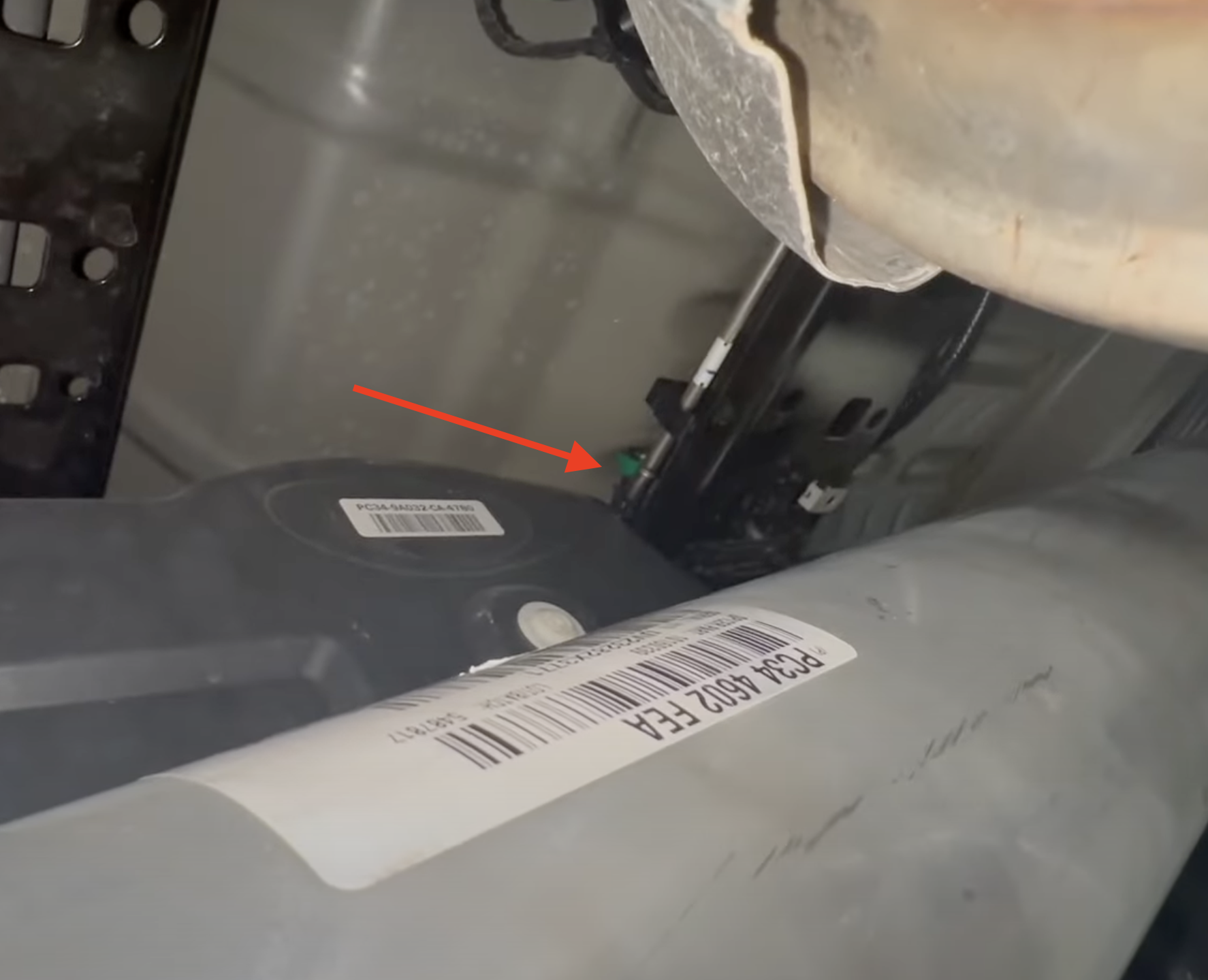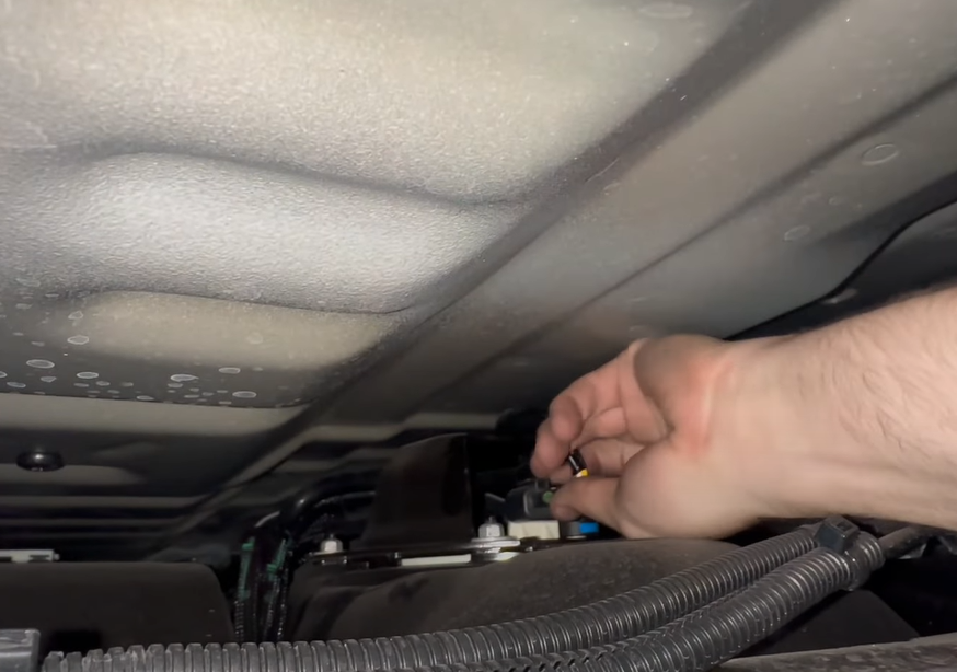 On 2023-24 Models, there is a fuel line that connects into the DPF. To remove this line, depress the button and slide out the green tab.