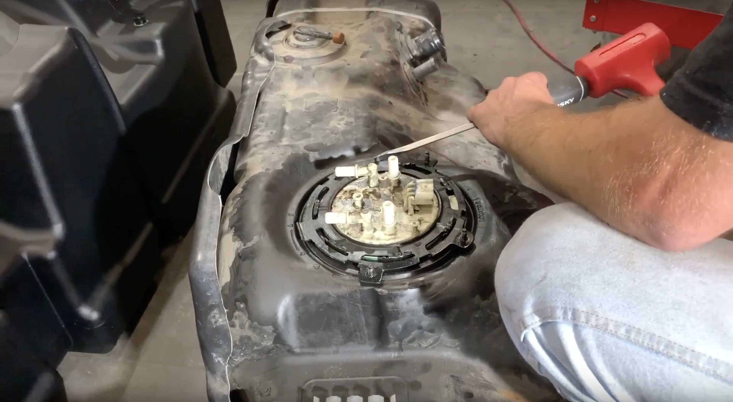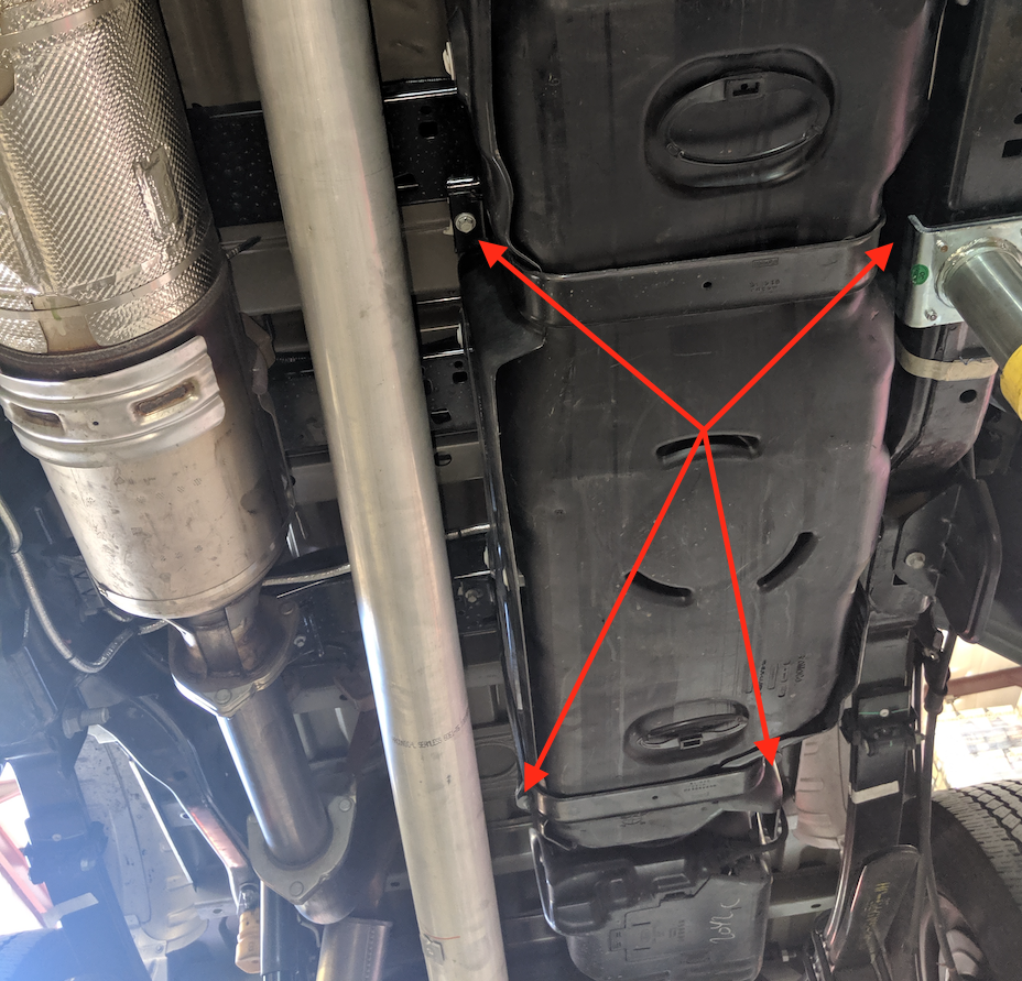 Remove the 4 bolts holding the 2 tank straps in place with a 13mm socket. Do NOT use a drill/air ratchet or you risk spinning the cage nuts.