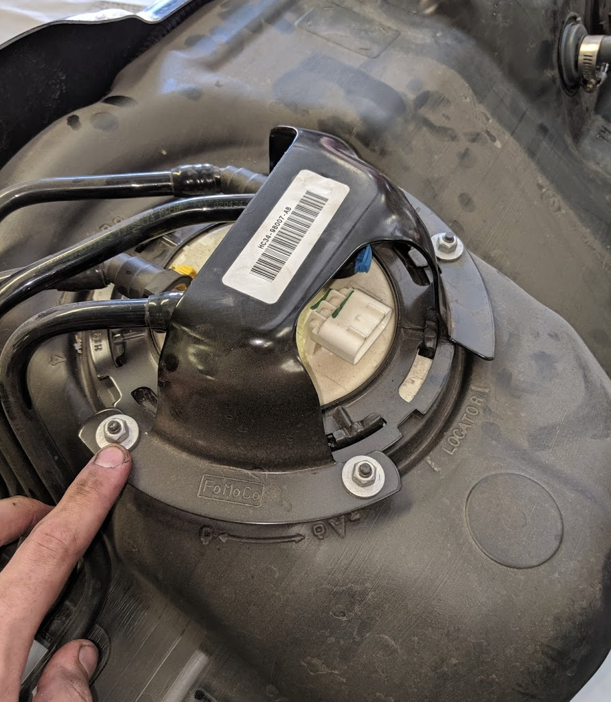 Remove the 3 nuts that hold the sending unit guard to the locking ring with a 10mm socket. It is important to remember the orientation of the sending unit guard.