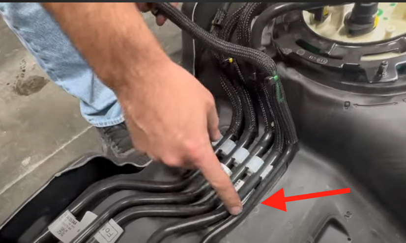 Remove the fuel lines from the hold down on the OEM tank. Simply pull upwards on the lines to pop them out. The new DPF line that is pointed out in the picture will not have a place in the bracket.