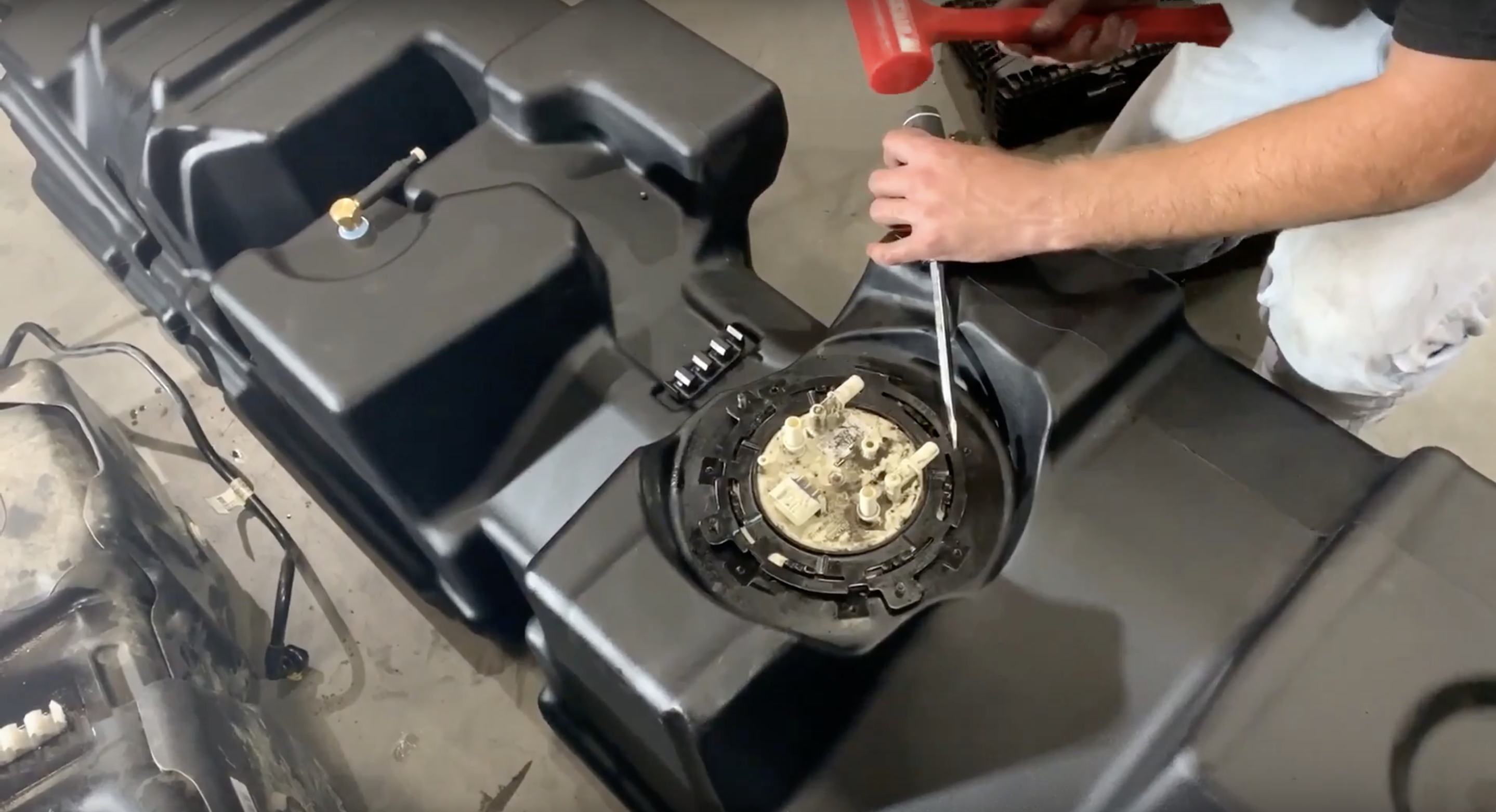 Secure the sending unit into the tank. Make sure the locking ring is oriented as it was on the OEM Tank so the sending unit guard will install without interference. Hammer the locking ring clockwise and ensure the rib on the locking ring slides into the indentation of the receiving ring on your S&B Tank.