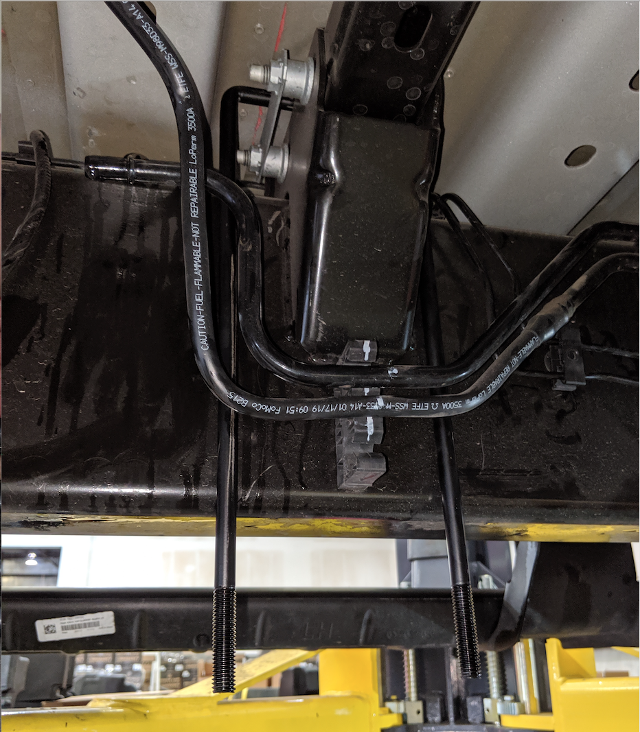 Remove the two fuel lines from the bracket on the frame. Slide the wider U Bolt up and over the crossmember. Position it between the fuel lines and the frame rail. Reinstall the fuel lines into the bracket.