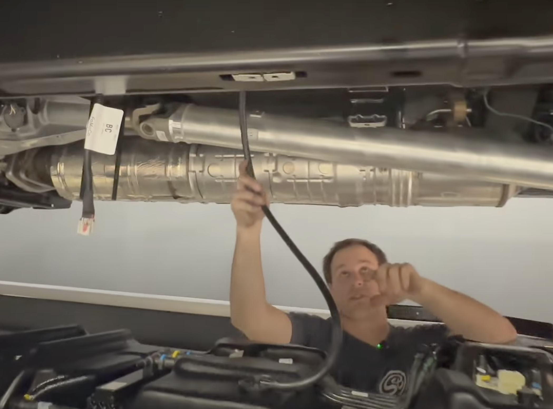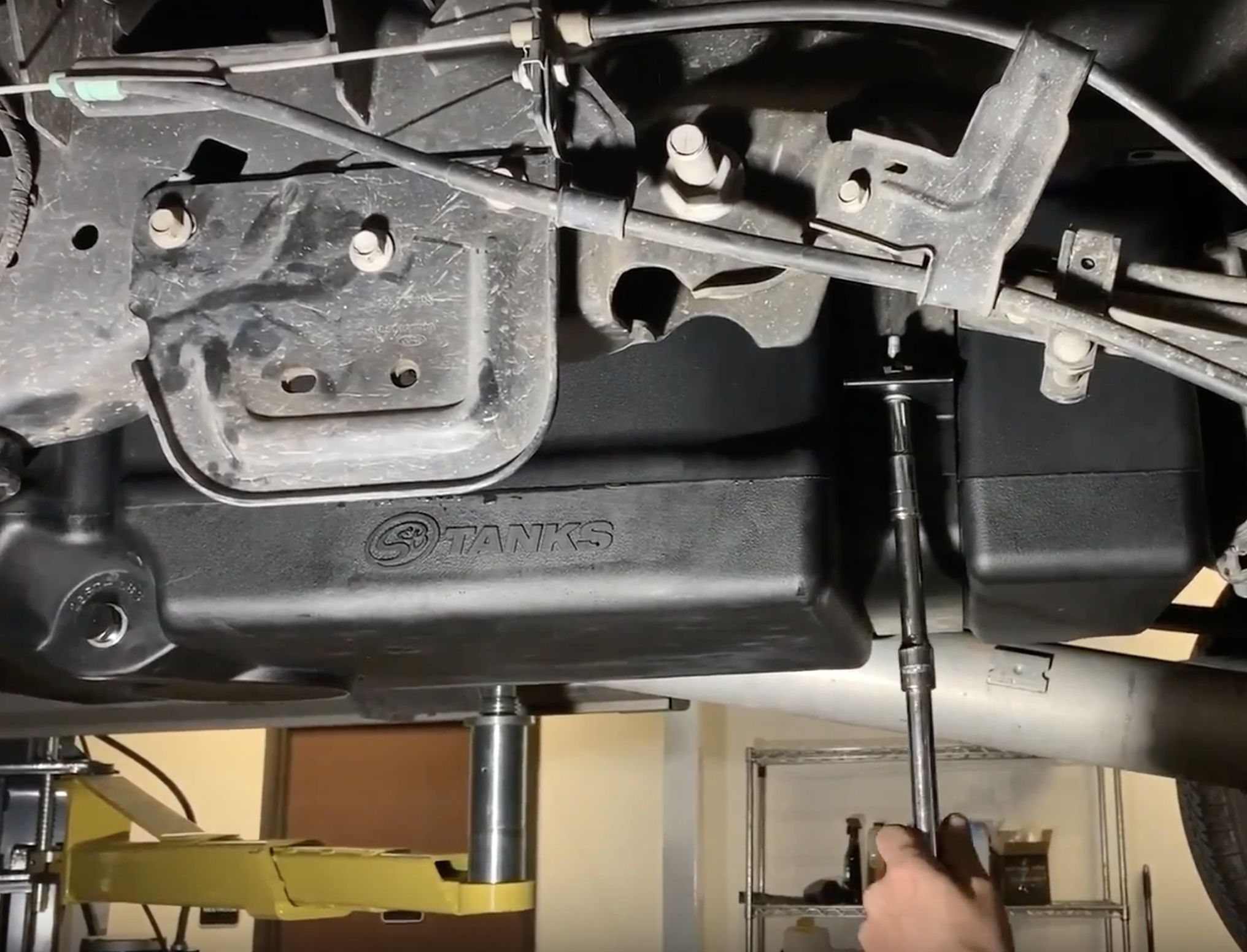 With the tank fully raised, install the tank straps and bolts(30 lb.ft (40 Nm). All 4 strap bolts are 13mm. We like to install the longer of the 4 bolts in the middle strap driver side bolt position.
