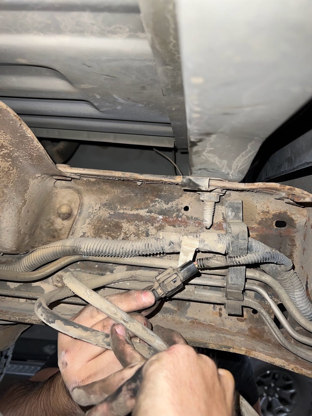 Drop the fuel tank down about 6″ to give yourself access to the electrical connector, fuel lines and rollover valve lines. Be careful to not break the fuel lines when lowering the tank. Press the button on the electrical connector and disconnect.