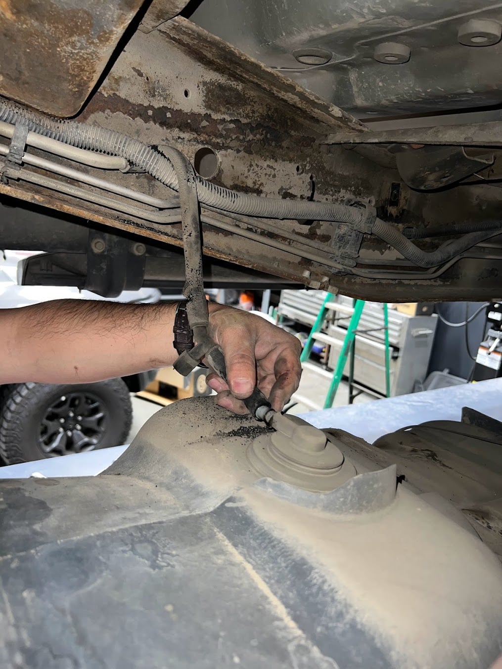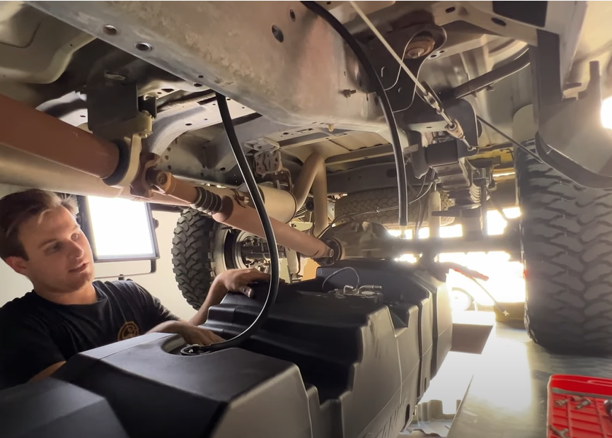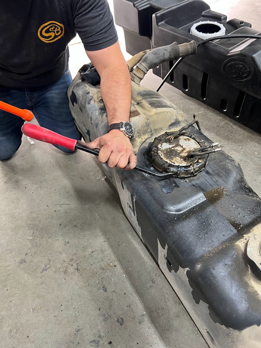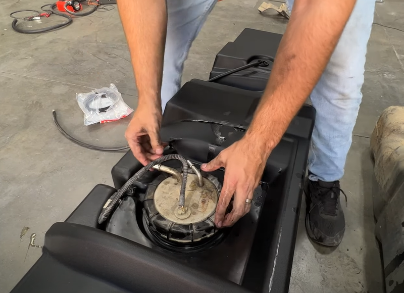 Drain your original fuel tank before beginning the S&B Installation process. S&B Tanks recommends removing only an empty or near empty tank for your safety. We recommend using a siphon or electronic transfer pump.