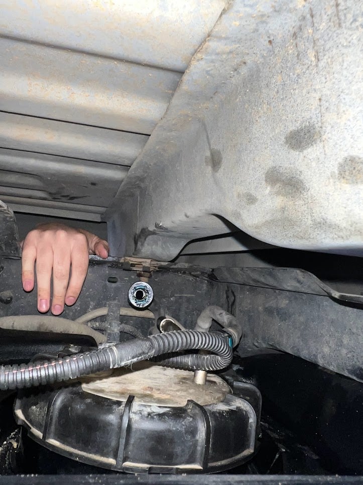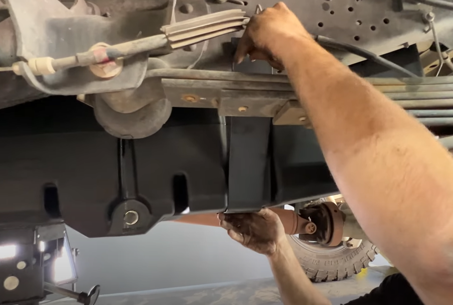 If you truck has this plate in front of the OEM tank. Remove with a 15mm socket.