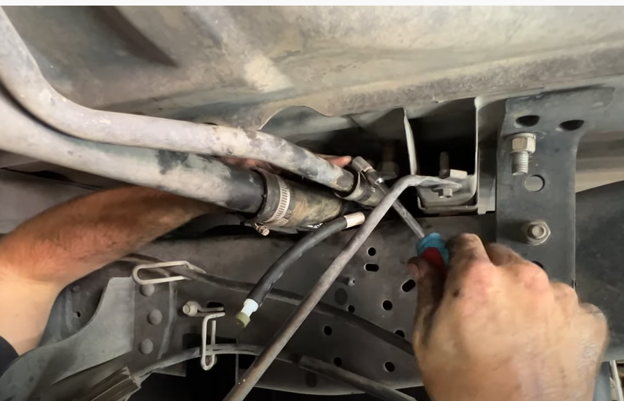 Reinstall the filler and vent lines. Route the front 5/16″ vent line along the top of the frame rail and zip tie to the filler.