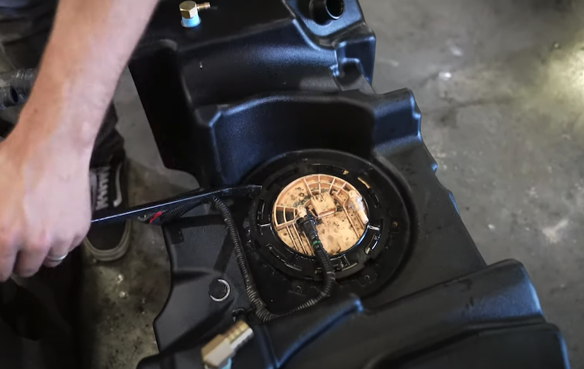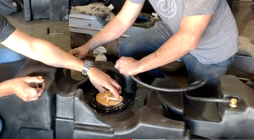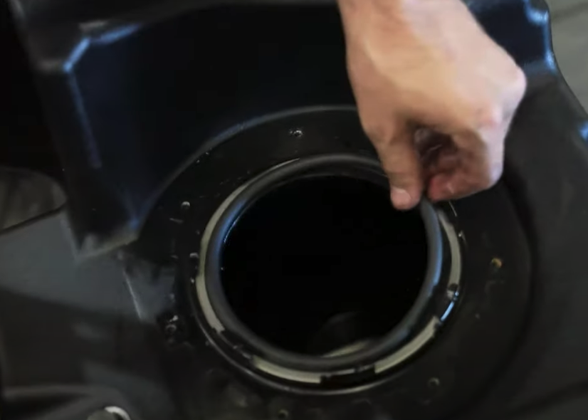 After the tank has been dropped. Remove the OEM fuel sending unit locking ring from the tank by hitting the ring counterclockwise. The OEM o’ring won’t be used again.