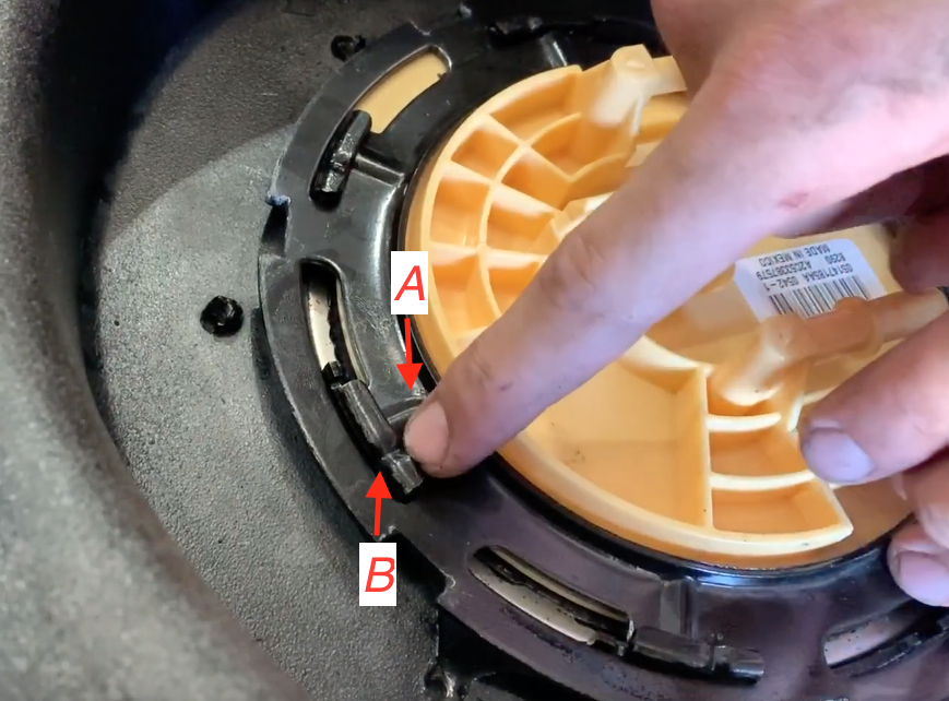Ensure the locking ring is fully rotated until the rib on the OEM locking ring(point A) is PAST the indentation on the S&B receiving ring(point B).