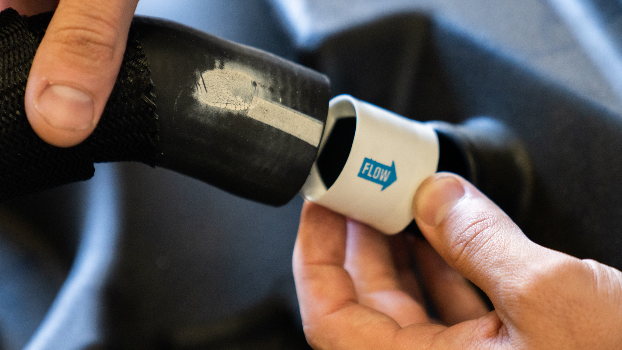 Before putting the filler hose onto the tank, place the white check valve into the filler hose with the blue arrow facing into the tank opening