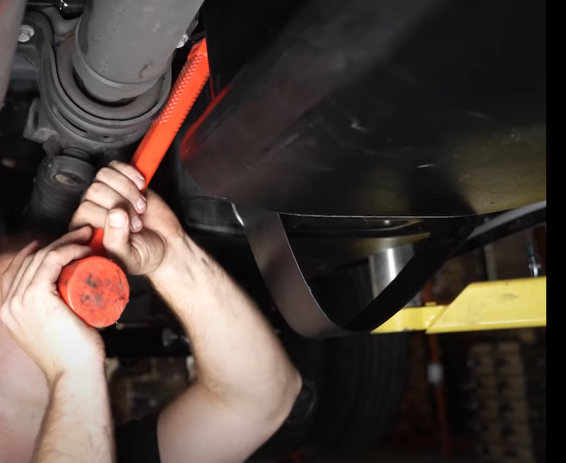 Use the end of a rubber mallet or pry bar to pass the strap past the carrier bearing mount