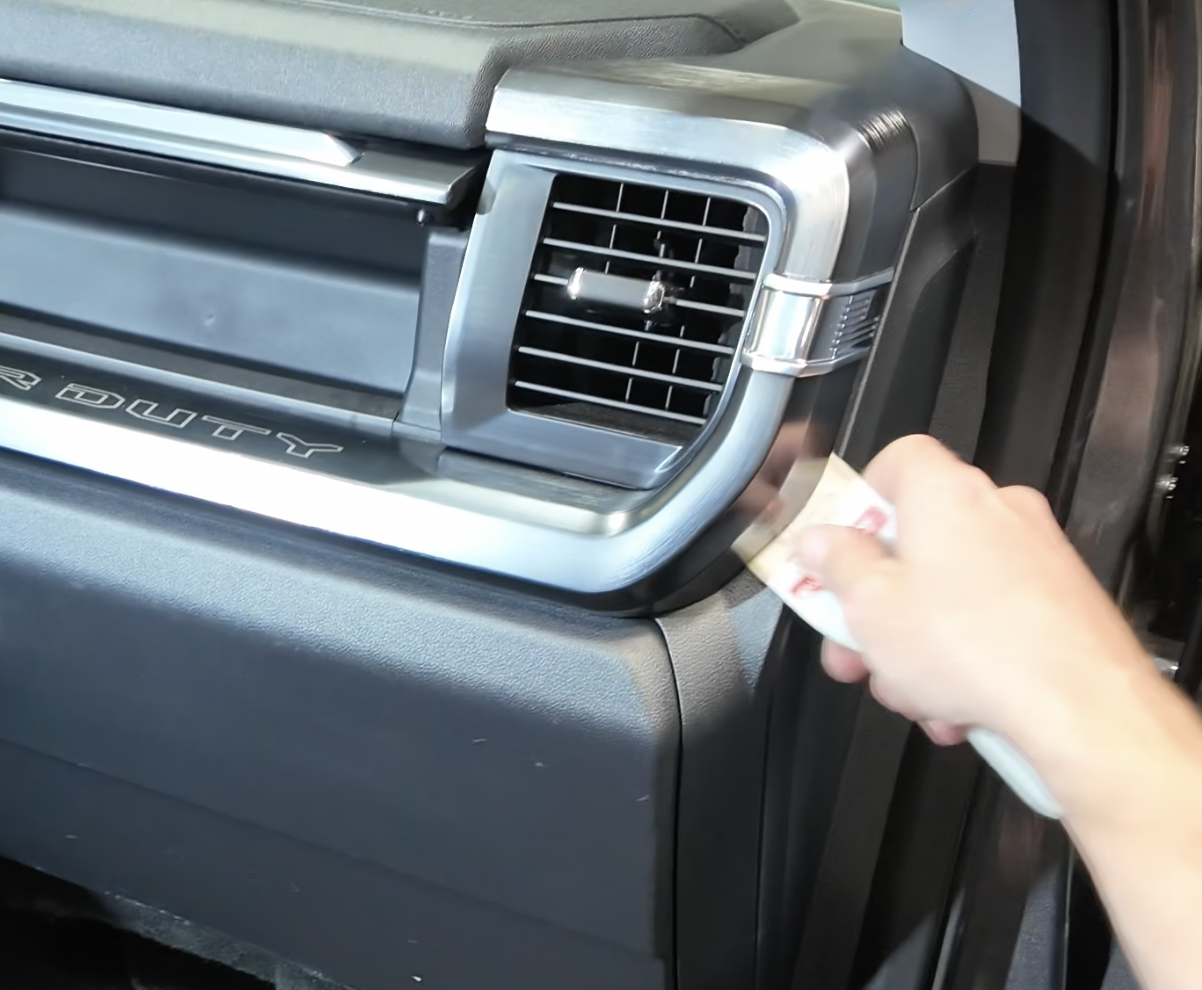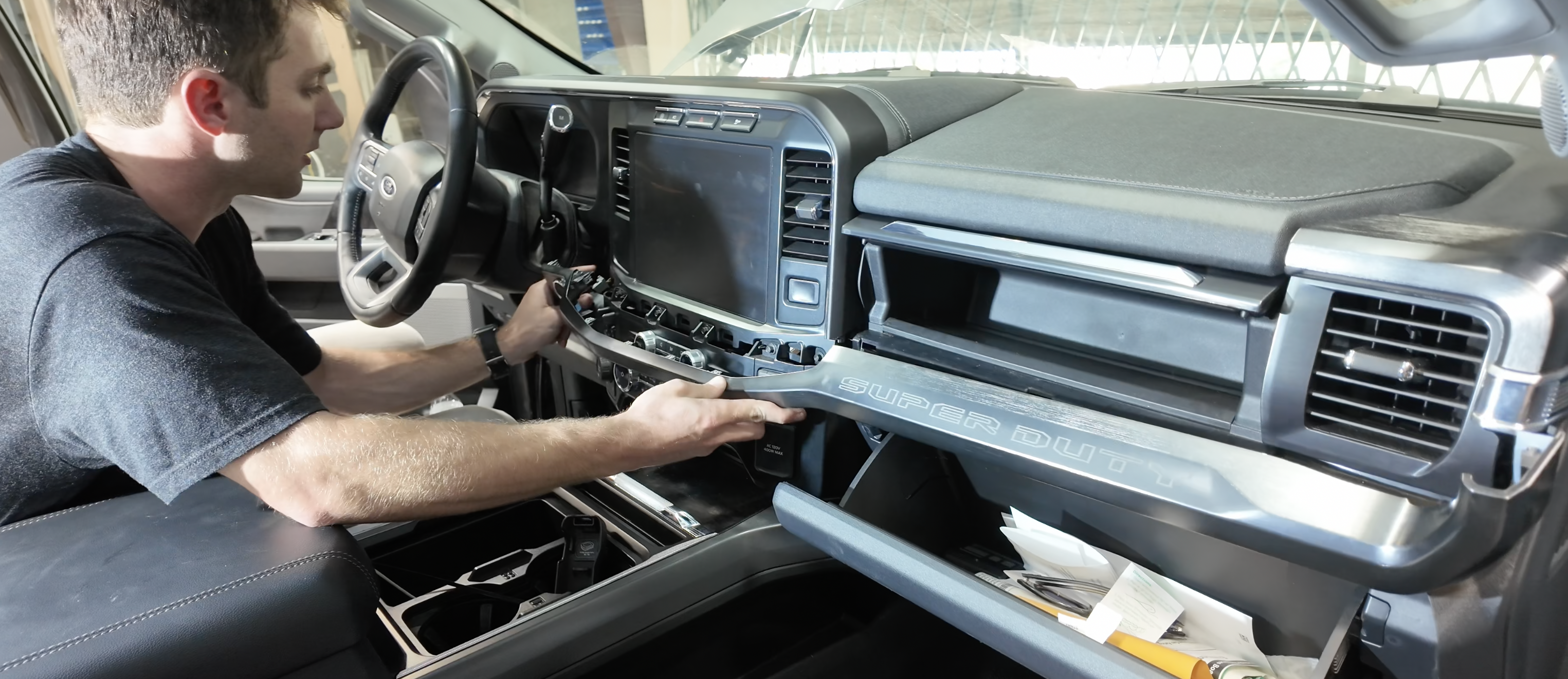 Using a plastic panel removal tool, pop out the trim located just below the front dash. This will all be one piece and stretches all the way to the “Push to Start” button.