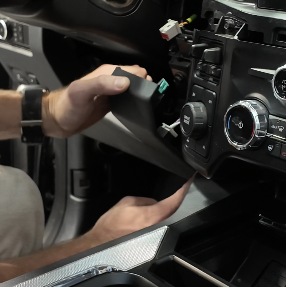 Plug the Push to Start ignition connector back into place. Then, go ahead and re-install the center trim piece back into place.