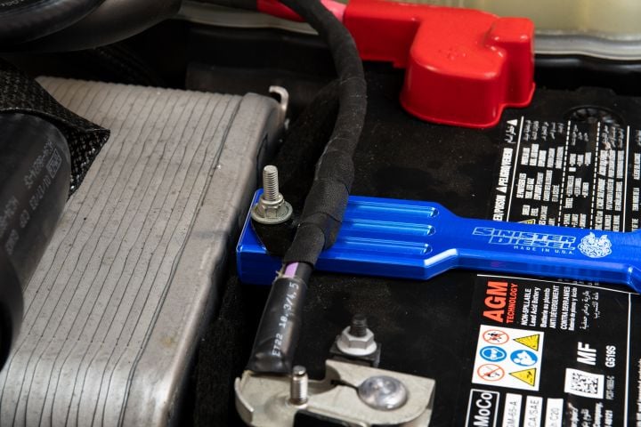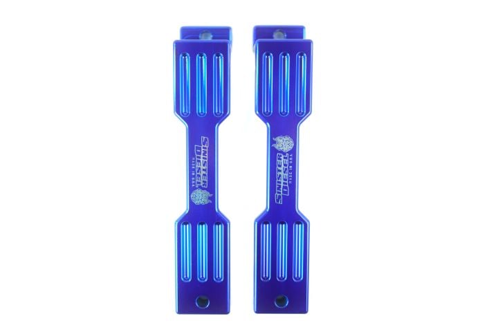 These Sinister Diesel battery hold-downs secure your battery while adding style. CNC-milled from billet aluminum and powder-coated in Sinister Blue for durability, they come in a set of two for both batteries.