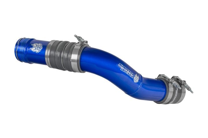 The Sinister Diesel Hot Side Charge Pipe for 2011–2022 6.7L Ford Powerstroke is a high-performance upgrade made from durable 6061 aluminum alloy. It improves engine airflow, reduces turbo lag, and boosts power and torque. Featuring mandrel-bent tubing for optimized airflow and a Signature Sinister Blue powder-coated finish, it combines enhanced performance with a sleek engine bay appearance.