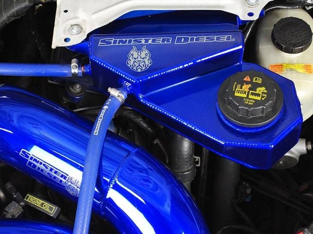 Sinister Diesel’s new Coolant Reservoir is a high-performance upgrade made from durable 6061 aircraft-grade aluminum, TIG welded and pressure tested for strength. Unlike factory plastic tanks prone to cracking and leaking, this aluminum design offers improved heat dissipation, enhancing engine performance and longevity. It reuses the factory cap (with upgrade options), includes a sight glass for easy fluid checks, and installs in under 30 minutes with basic tools.