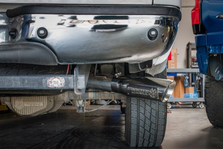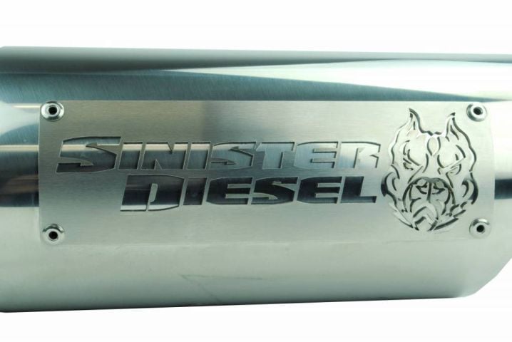 Give your Ford Super Duty Powerstroke, Dodge Ram Cummins, Chevy Silverado/GMC Sierra Duramax or any vehicle equipped with a 4″ exhaust tail pipe a bold look with the Sinister Diesel Dual Wall Exhaust Tip.