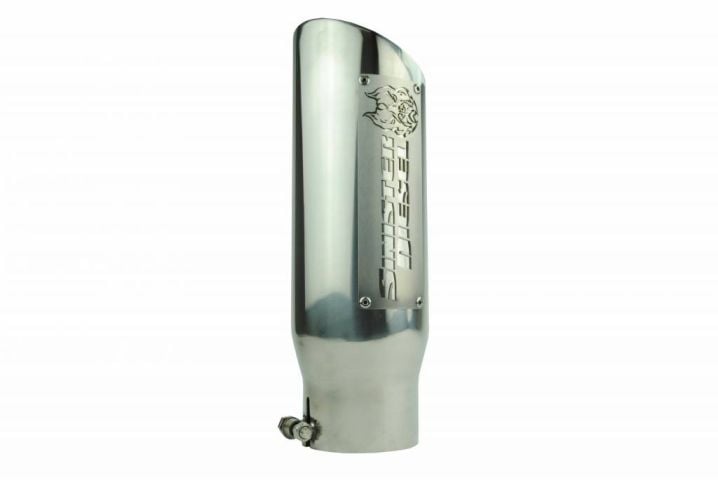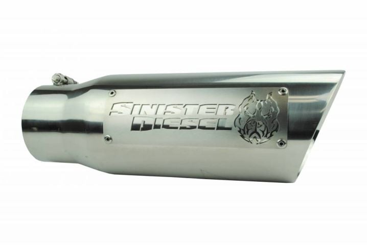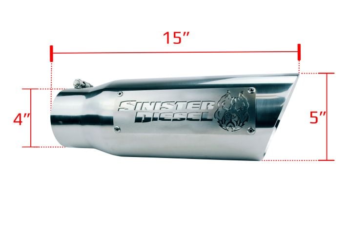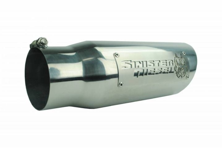 We make every Sinister Diesel dual wall exhaust tip from corrosion-resistant stainless steel for durability and long life. This dual wall 4″ to 5″ diesel exhaust tip fits any 4″ tailpipe and gives you a larger 5″ outlet with a angle cut edge. This diesel exhaust tip is also protected with a high-quality chrome finish for a clean look. We give each exhaust tip a finishing touch with an eye grabbing riveted on Sinister Diesel logo on the side.