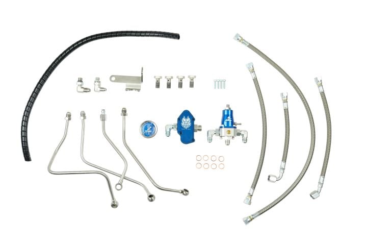 Introducing the Sinister Diesel Regulated Fuel Return Kit specifically designed for the Ford Powerstroke 6.0L engine. This kit is a comprehensive solution for improving fuel system performance, reducing fuel pressure fluctuations, and enhancing overall reliability.