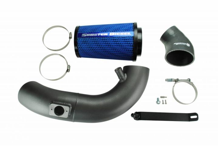 Sinister Diesel uses aluminum tubing with a CNC mandrel bend, ensuring smooth airflow through the cold air intake. High-grade silicone couplings resist high temperatures. The cotton filter is washable, so you don’t need to replace it. All mounting hardware comes included and installation is simple.