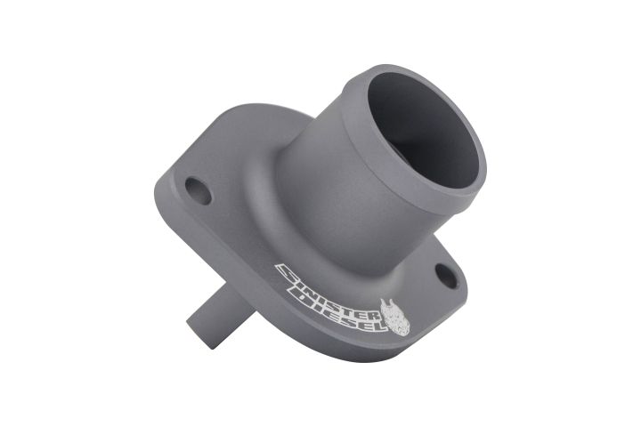 The Sinister Diesel Thermostat Housing is a direct replacement for the OEM version, offering improved durability and appearance. Made from anodized billet aluminum, it resists corrosion, while precision CNC machining and a thick base plate ensure a long-lasting seal. It features a Limited Edition Sinister Gray finish for enhanced engine bay aesthetics.