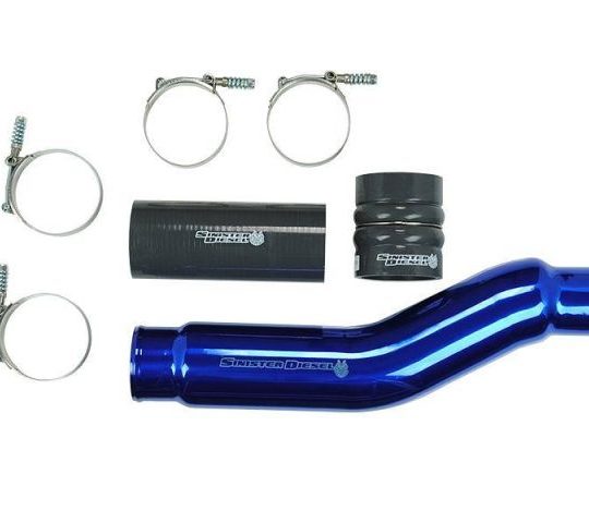 The Sinister Diesel Cold Side Charge Pipe Kit for the Cummins 6.7L replaces the factory piping to improve airflow, reduce exhaust gas temperatures, and boost horsepower and torque. Made from durable 6061 aluminum with smooth mandrel bends, it enhances performance and reliability. The kit includes 5-ply silicone boots rated to 400psi and stainless steel clamps for secure connections, and features a high-gloss Sinister Blue powder coat for a sleek appearance.
