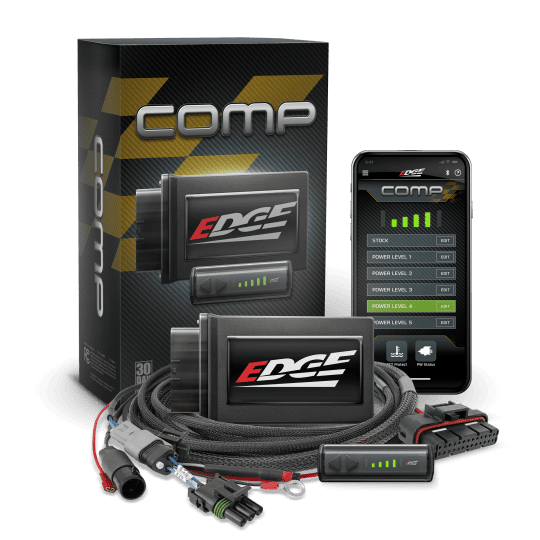 The Edge Comp Box 2.0 performance module upgrades 1998.5–2002 Dodge Ram trucks equipped with the 5.9L VP44 Cummins engine. The plug-and-play module provides five adjustable power levels with gains up to 180 horsepower and 400 lb-ft of torque. Drivers can adjust fueling and timing using the smartphone app with Bluetooth connectivity. The system works with stock or modified trucks and supports larger injectors and turbo upgrades. It also pairs with Edge Insight monitors for real-time engine monitoring.