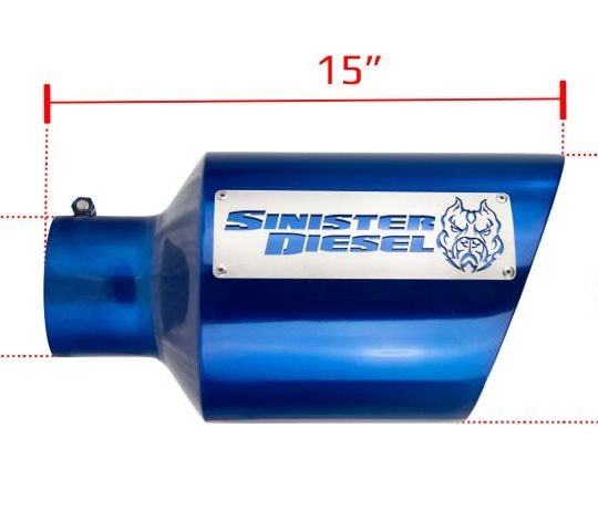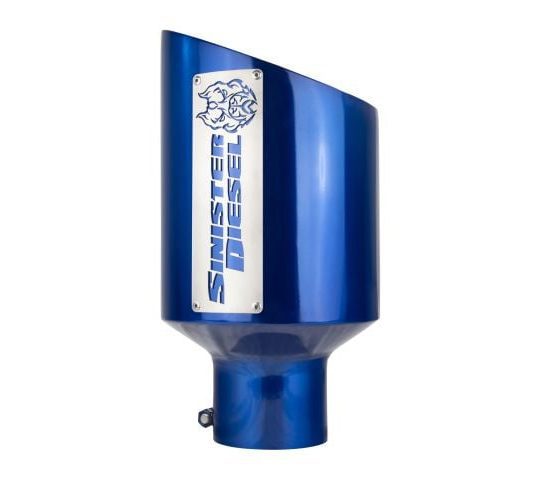 The Sinister Diesel Dual Wall Exhaust Tip enhances the look of diesel trucks with a 4″ exhaust tailpipe, including Ford Super Duty Powerstroke, Dodge Ram Cummins, and Chevy Silverado/GMC Sierra Duramax. Made from corrosion-resistant stainless steel for durability, it expands the outlet to 8″ with an angled cut edge. The tip features a high-quality Sinister Diesel blue finish and a riveted Sinister Diesel logo for a bold appearance.