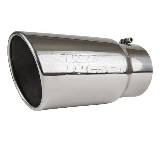 Sinister Diesel offers high-quality, aggressive-looking exhaust tips designed to enhance the appearance of diesel trucks. Made from durable 304 stainless steel and mirror-polished for a flashy, easy-to-clean finish, these single-wall tips fit 5-inch tailpipes and expand to 6 inches with a rolled edge. Each tip features the Sinister Diesel logo and is crafted for both performance and style.
